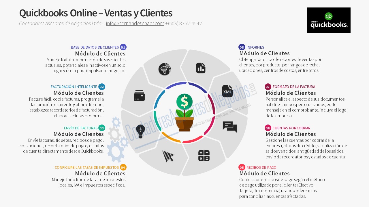 Es un programa intuitivo, fácil de usar y adaptable para pequeñas y medianas empresas que permite mantener el control de las operaciones diarias de su negocio. El sistema incluye los siguientes módulos: bancos, facturación, cuentas por cobrar, inventario, cuentas por pagar y contabilidad.
